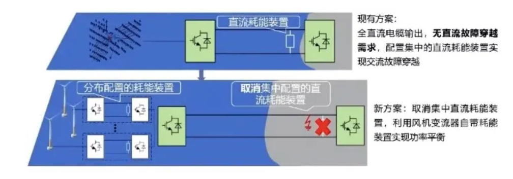 高压柔性直流输电技术是目前深远海风电送出工程的重要技术方案,已投运的国内外海风柔直工程均在陆上换流站配置直流耗能装置来实现故障穿越,避免陆上交流电网侧发生故障时,因海上风机功率调节速度过慢导致直流海缆能量堆积、电压升高,造成设备损坏和系统停运。在阳江三山岛海上风电直流输电工程中,南方电网科研院创新性地提出利用风机全功率变流器自带的耗能装置实现盈余功率分散式就地耗散的方案,助力工程降本增效。