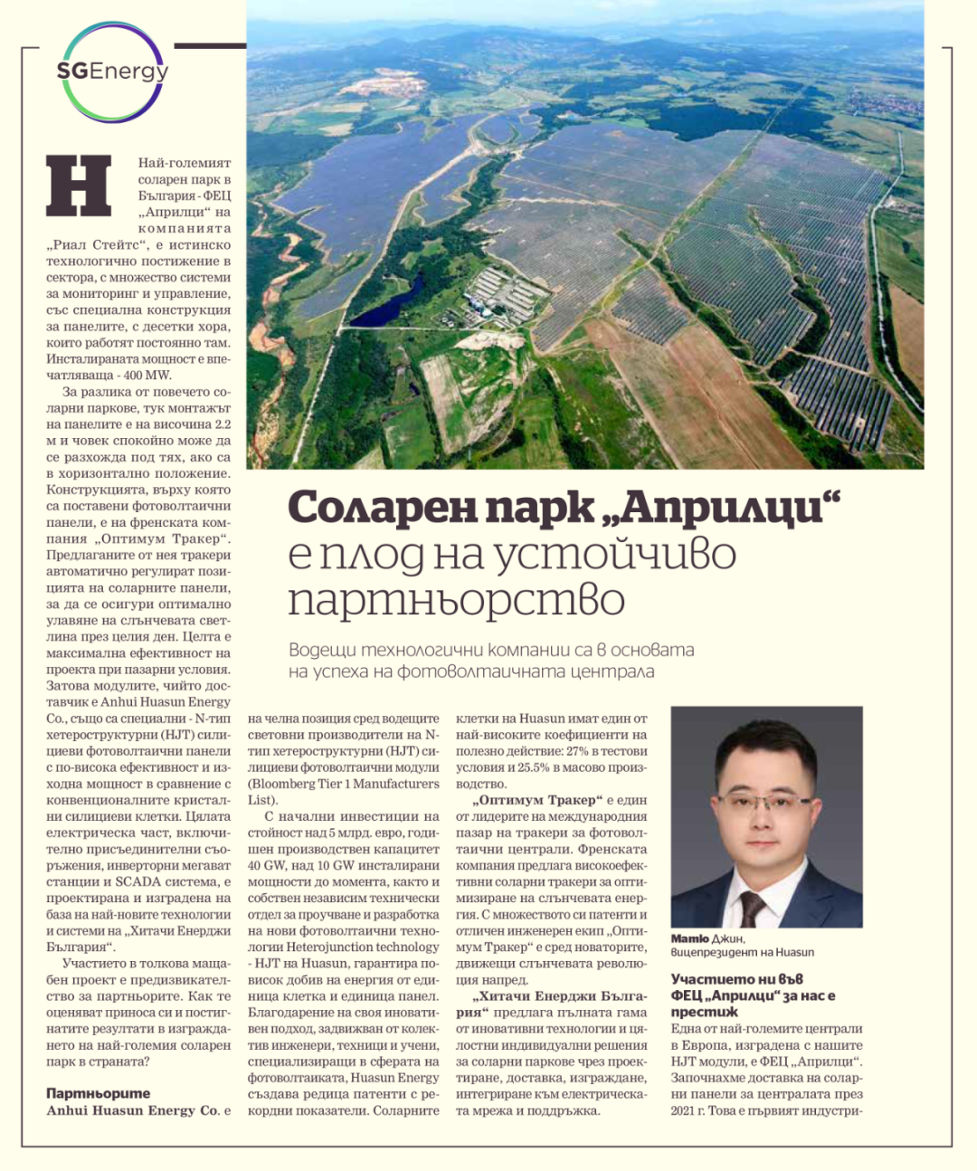 华晟新能源副总裁金磊在接受采访时表示,“我们很荣幸能够参与到这个全球最大的异质结光伏项目当中,这也是保加利亚第一个完全采用高效双面异质结组件建造的太阳能项目。在电站建设过程中,我们与项目方Real States和承建方Inercom紧密合作,所交付产品完全符合工程要求。在未来的长期合作中,华晟也将持续为该地区提供GW级以上高效异质结组件产品,助力巴尔干地区能源转型。”
