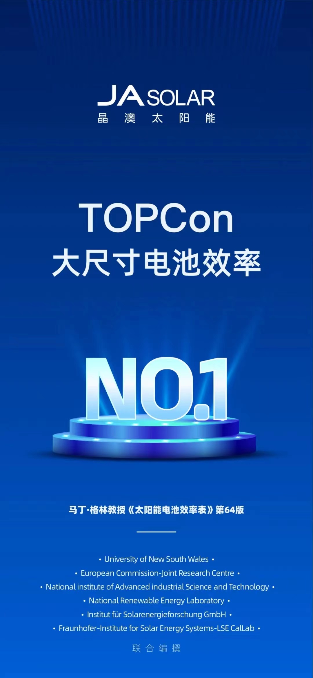 全球领先,持续高效!晶澳科技荣登TOPCon大尺寸电池效率榜首