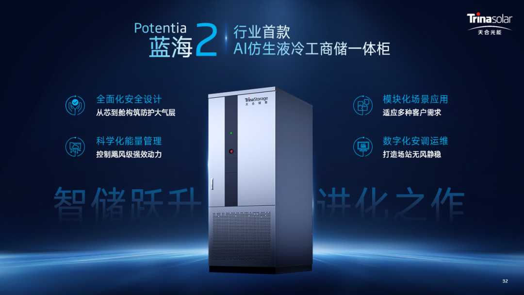 新一代Potentia蓝海2秉持产品优化、技术创新、服务精进、场景拓展的四维升级理念,依托领先的研发优势及深耕市场的渠道能力,引领工商储能赛道再次进化。产品搭载全栈自研车规级A级优+314Ah天合芯,整机依托Pack Pro电池模块消防设计,从芯到舱构筑产品安全。