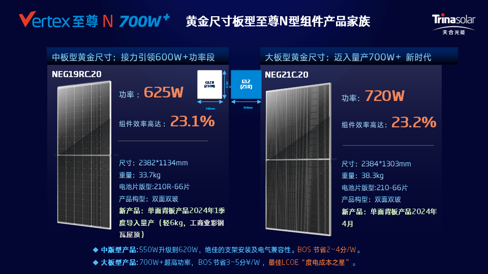 高效光伏组件是光伏发电系统的核心,得益于新一代i-TOPCon先进技术升级,载流子增强烧结技术提效0.3%+,至尊N型大版型功率达到720W。得益于高功率、低开路电压的优势,至尊N型720W组件具有显著的BOS成本优势,为终端用户提供前瞻性的选择。