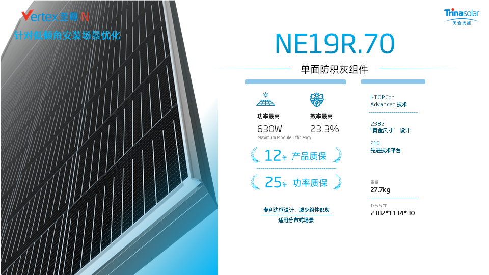 为了有效减小积灰影响,保证组件寿命,带来更高发电量,天合光能研发团队经过不断的投入与探索,优化边框设计,推出了全新防积灰组件。