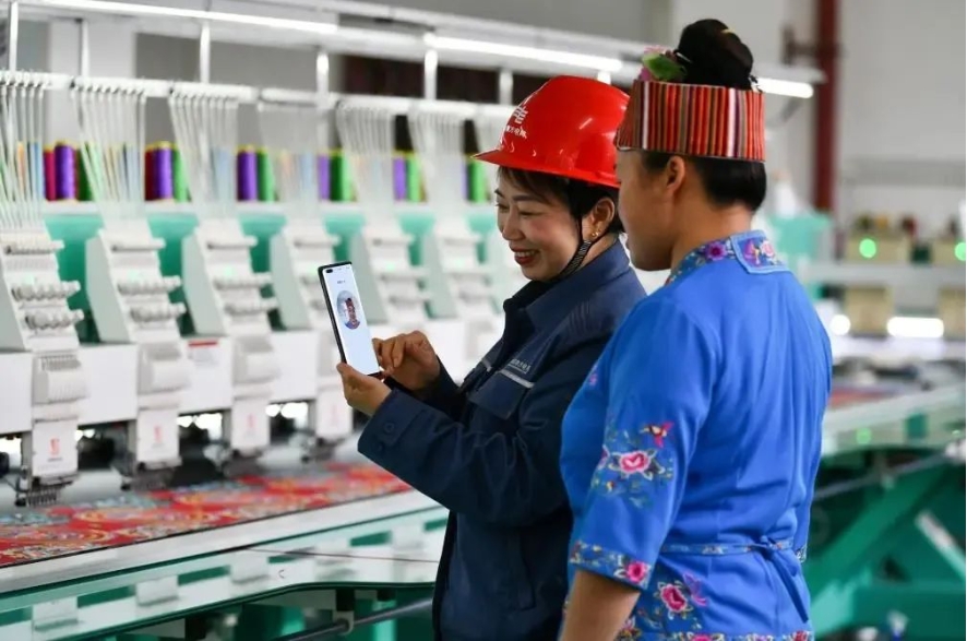 ▲贵州电网公司员工向一家苗族服饰开发企业介绍“南网在线”APP功能