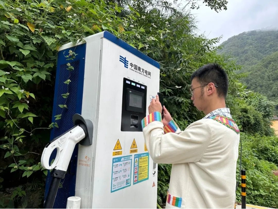 ▲新能源车主在云南怒江州独龙江乡使用充电桩