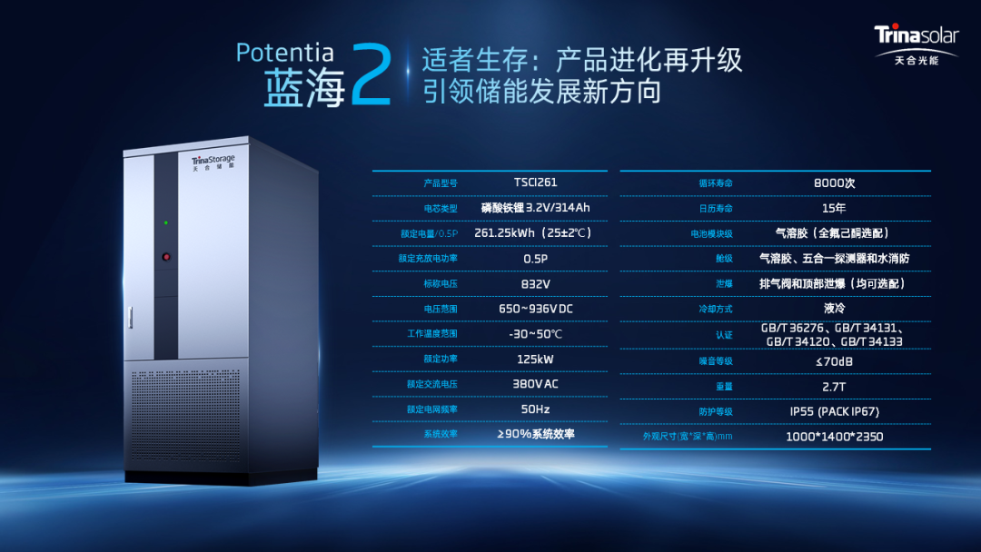 新一代Potentia蓝海2秉持产品优化、技术创新、服务精进、场景拓展的四维升级理念,依托领先的研发优势及深耕市场的渠道能力,引领工商储能赛道再次进化。产品搭载全栈自研车规级A级优+314Ah天合芯,整机依托Pack Pro电池模块消防设计,从芯到舱构筑产品安全。