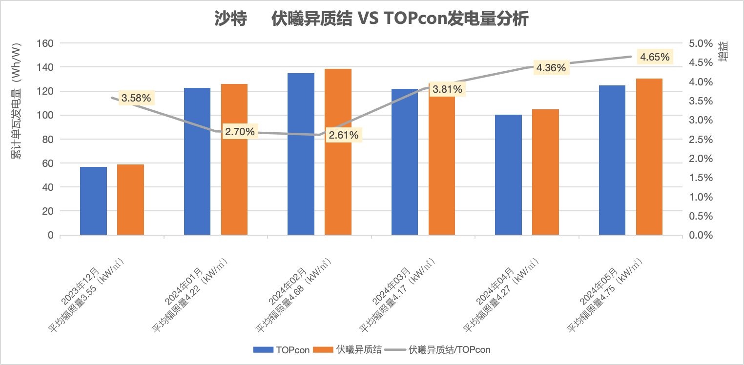 东方日升沙特实证基地的最新实证数据显示:伏曦在2023年12月至2024年5月期间,日均单瓦发电量达4.31Wh/W,发电增益比同场站的TOPCon组件高3.58%。这相比于2023年月至2024年2月期间的增益数据(2.82%),提升了0.76个百分点。单月数据方面,2024年4、5月,沙特当地的日均辐照量分别达到了4.27kwh/m2、4.75 kwh/m2;日均温度分别高至39.89°C、44.64°C,是远超中国普遍伏天的高温环境。在此环境条件下,异质结伏曦组件的月累计发电量分别达104.74 Wh/W、130.49 Wh/W,发电增益比TOPCon分别高出4.36%、4.65%。