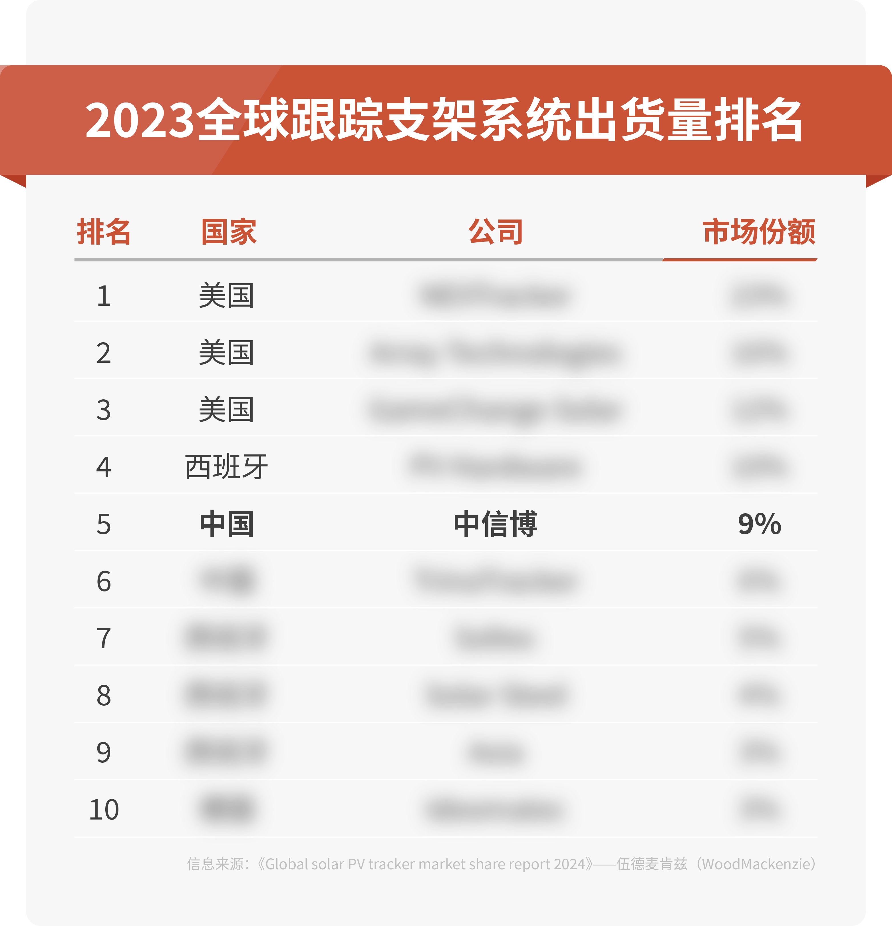 据报道,在国际知名能源咨询机构伍德麦肯兹(WoodMackenzie)发布的《Global solar PV tracker market share report 2024》中,中信博2023年度跟踪支架系统出货量全球市占率达9%,位列全球第五,是全球排名前五中唯一中国企业,持续领跑全球跟踪支架市场。