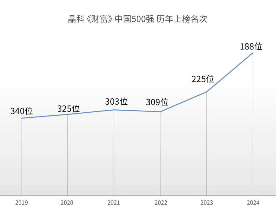 日前,晶科能源以第188位荣登2024《财富》中国500强排行榜,对比2023年的第225位跃升37位,实现1186.82亿元营收,展现出公司在光伏行业中的领先地位和强劲的增长势头,这也是公司连续10年入选中国500强。