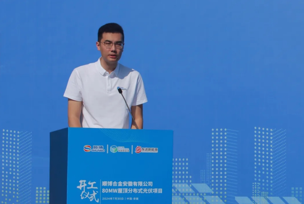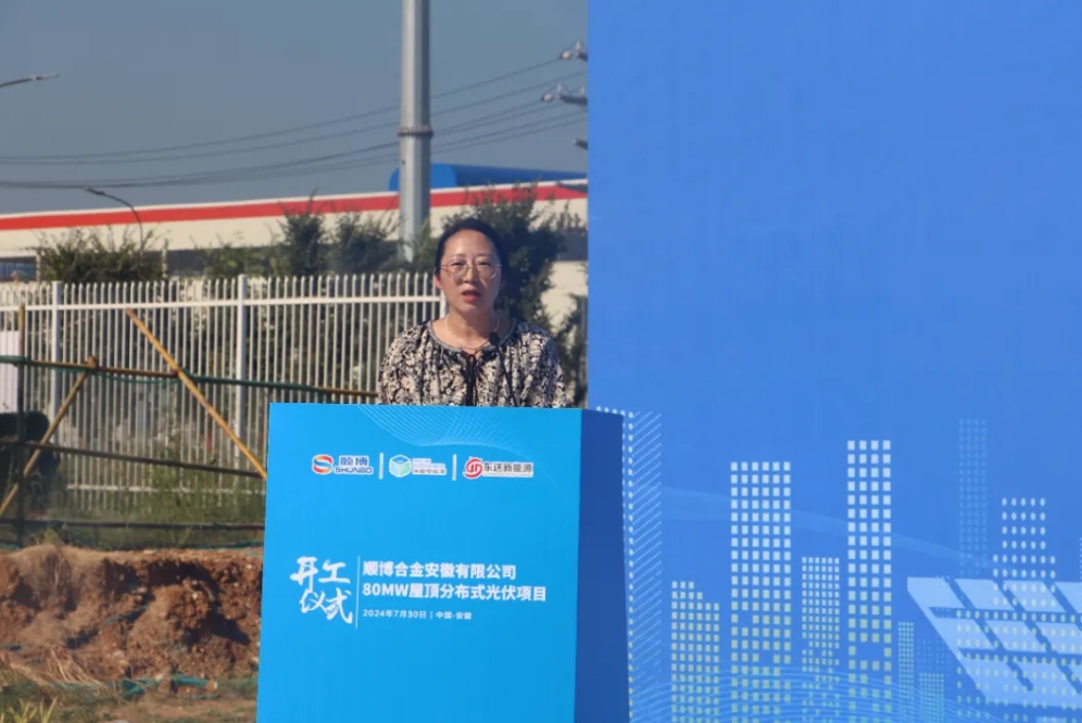 博望区财政局局长张琴琴在开工仪式上进行致辞。她表示,顺博合金与保碧新能源和东送新能源合作开展的80MW屋顶分布式光伏项目对博望区绿色发展和两新产业发展作用重大。该项目在博望区具有率先的意义,同时也是博望区首个大型分布式光伏项目。
