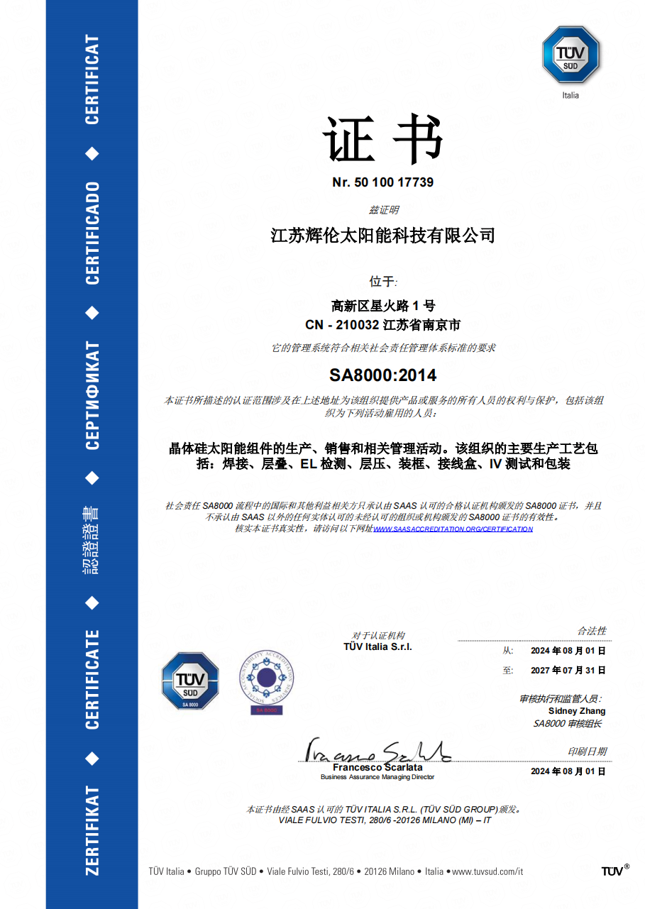 近日,苏美达能源旗下辉伦太阳能成功通过了SA8000社会责任管理体系审核,并获得了由 TÜV ITALIA S.r.l. 颁发、经社会责任国际组织(Social Accountability International, SAI)验证的SA8000社会责任管理体系认证证书,标志着苏美达辉伦对社会责任、商业道德和可持续发展的坚定承诺和深度践行得到国际权威认可。