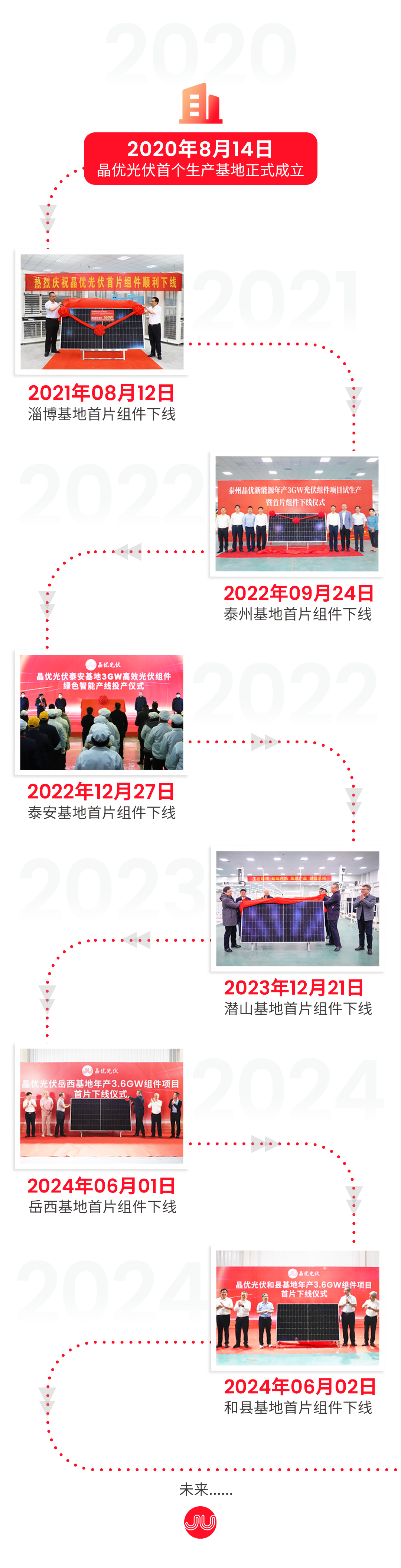 2020年8月,晶优光伏在山东淄博的一隅悄然扎根,短短四年间,以稳健的步伐,逐步构建起以上海为总部、横跨全国6大生产基地的布局。
