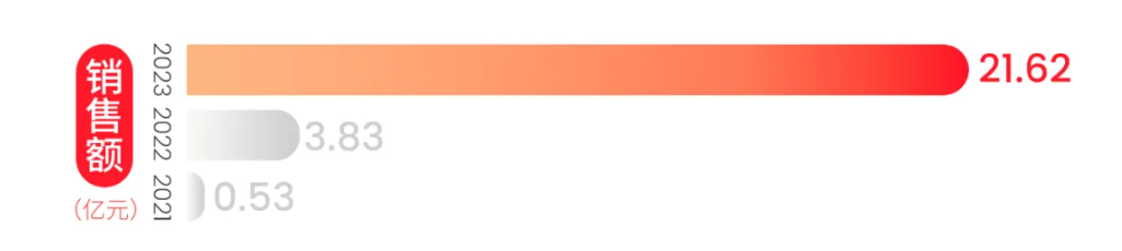 ● 自2021年8月至2023年12月期间,销售额持续稳健攀升。进入2023年更是实现飞跃式增长,2023年销售额21.62亿元,同比2022年3.83亿元,增长率达610%。