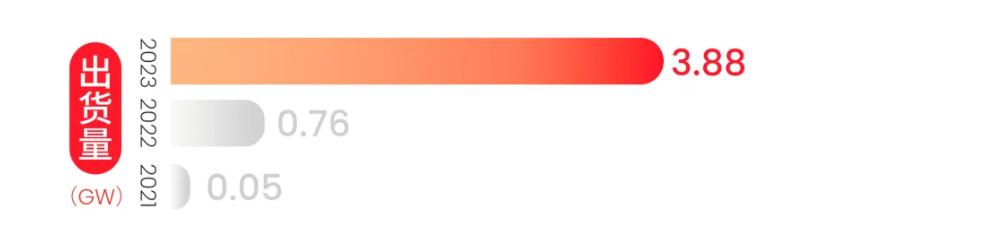● 自2021年8月至2023年12月,年度增长率实现逐年突破。2023年出货量达3.88GW,同比2022年出货0.76GW,年度增长率达410%。