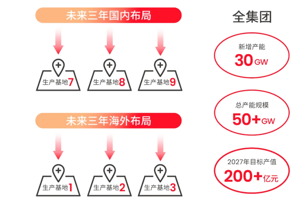晶优光伏首个三年规划已交出一份高分答卷,站在新起点上,晶优并未停步,下一个三年我们如初再起航,布局全球扬帆远行。未来三年,晶优光伏规划将新设6个生产基地,其中国内再布局3大生产基地,海外布局3大生产基地。全集团新增产能30GW,总产能规模超50GW,至2027年目标产值将超200亿元。