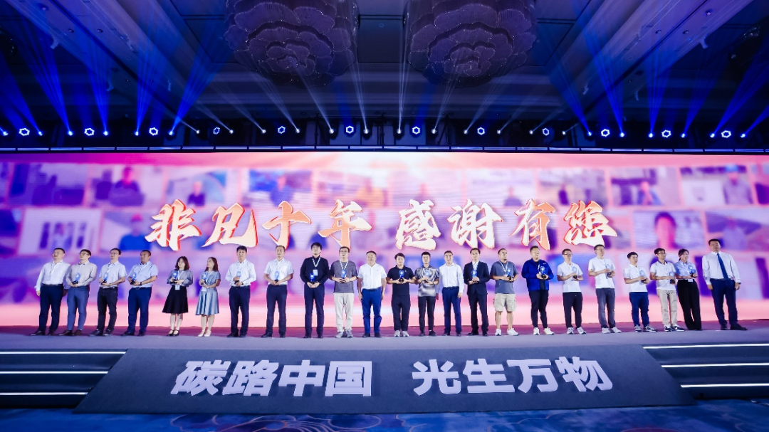 大会设置了“十年风雨同舟”特别策划环节,邀请了多位陪伴华为多年的客户,现场颁发了顶部镶嵌“非凡十年 感谢有您”的纪念章,该纪念章取材于十年前的逆变器部件,用时光镌刻华为与客户共同走过的路。