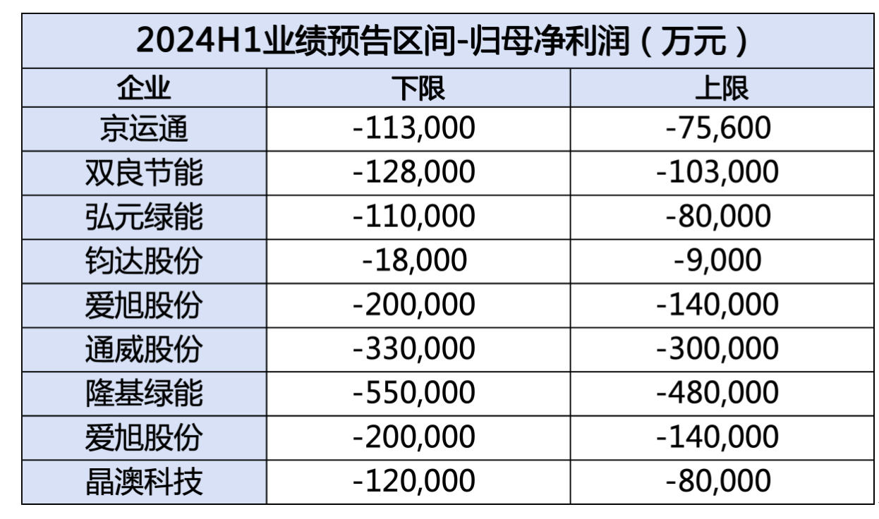 2023年,产业链各制造环节产能快速释放,供需比进一步恶化,光伏产品价格加速下跌;2024年上半年,光伏行业产能过剩加剧,多环节从成本竞争逐步转向现金流竞争;至第二季度,主产业链各环节进入销售价格与成本倒挂、净利润亏损阶段;6月底,已步入现金成本亏损阶段,光伏产业链业绩普遍承压。据统计,2024年上半年光伏产业链各环节部分企业的利润情况如下表(企业排名不分先后):
