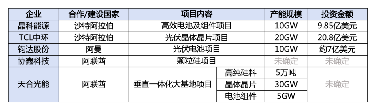 光伏行业公开信息显示,目前已有多家企业公布了海外产能项目,计划于当地开展光伏产能建设,详细的项目信息统计如下表(企业以最新公告时间由近及远排序):