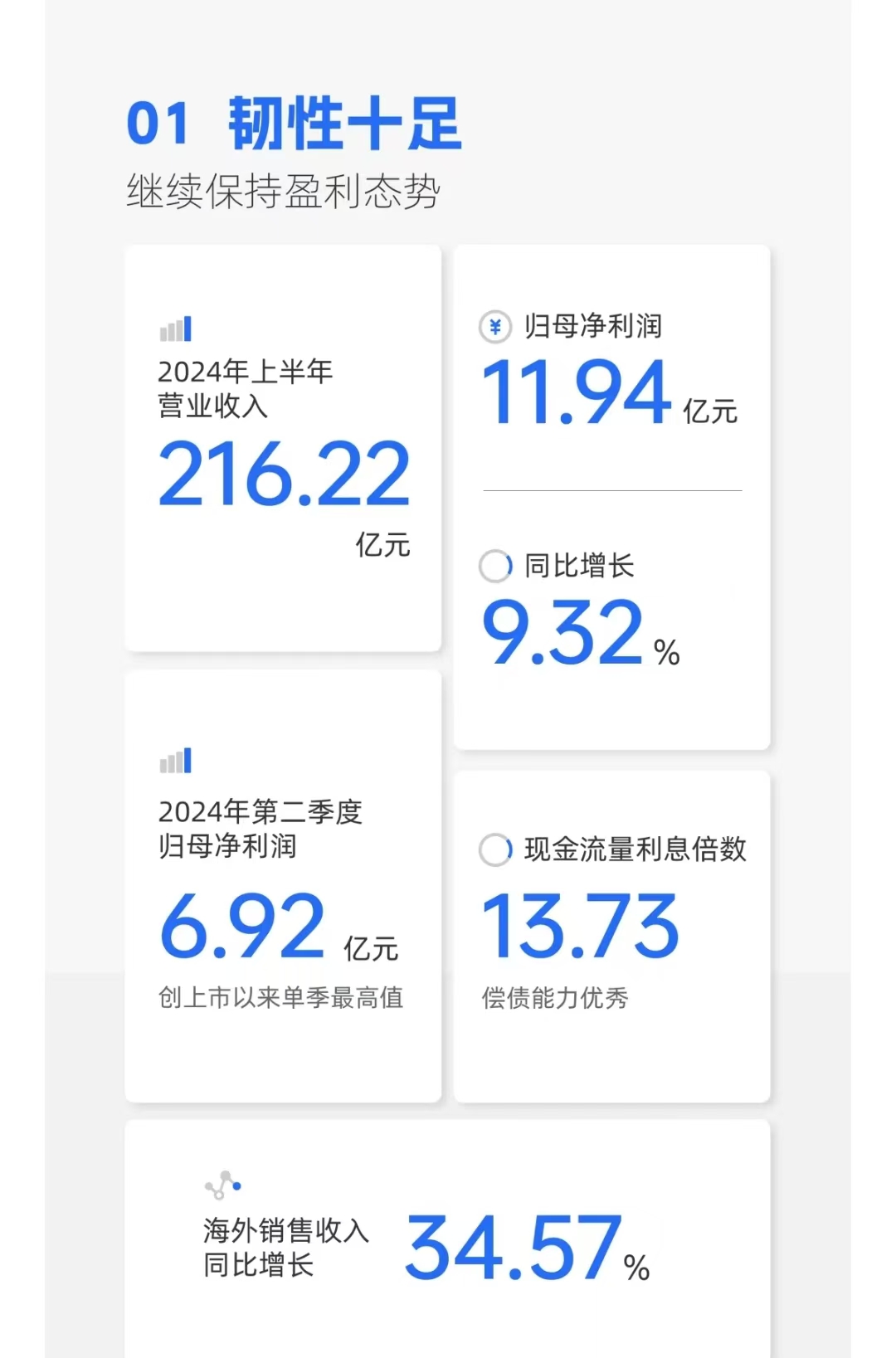 2024年上半年,尽管市场环境充满挑战,公司依然秉承"聚焦高质量、深耕可持续"的发展理念,以优质的业绩回报股东。报告期内,公司实现了营业收入216.22亿元,同比增长0.30%;归属于母公司的净利润达到11.94亿元,同比增长9.32%。
