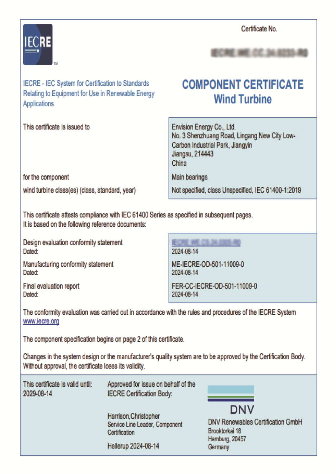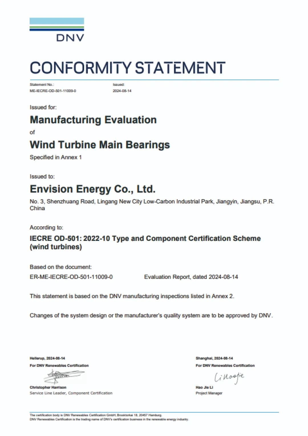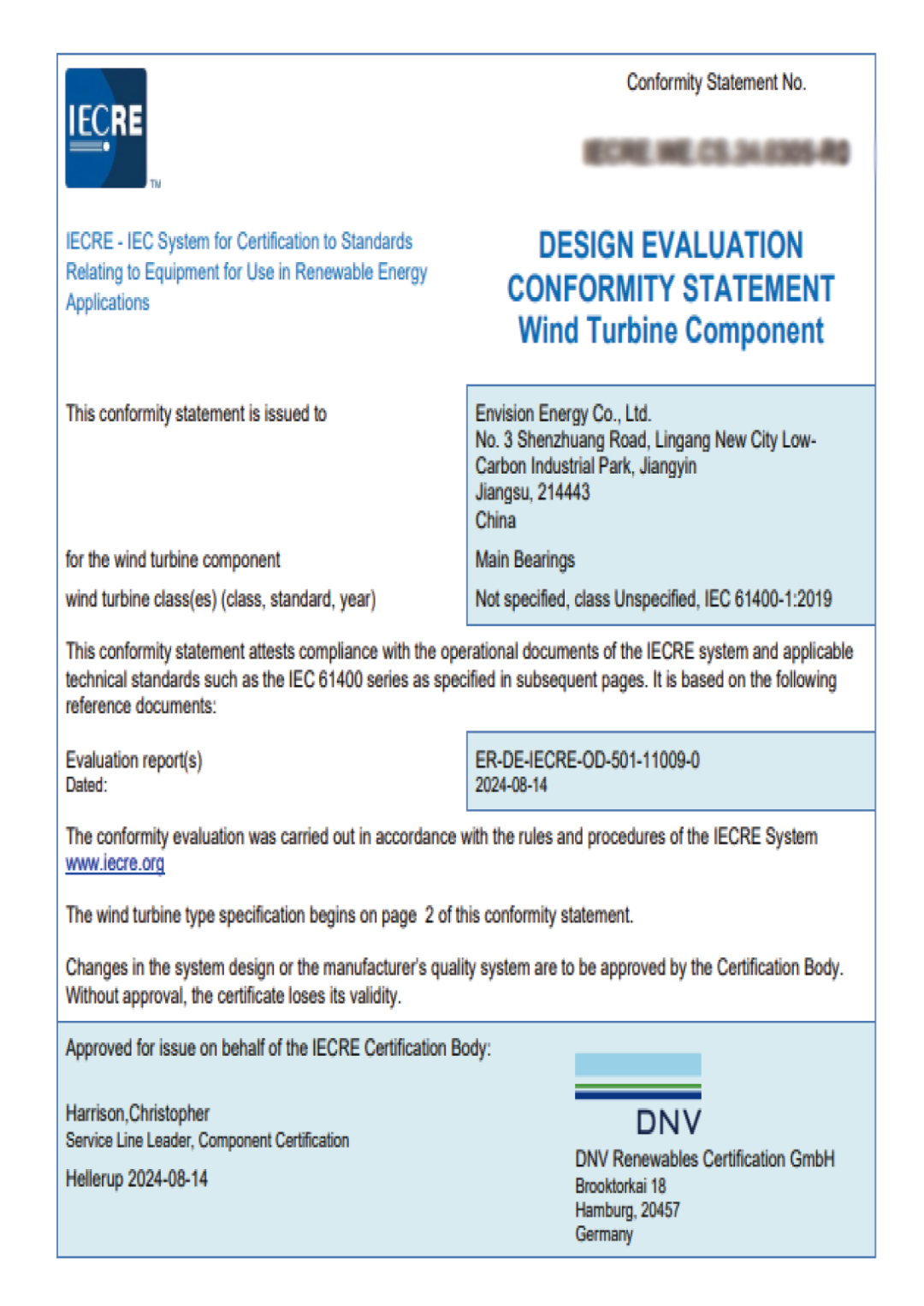 IECRE(国际电工委员会可再生能源设备认证互认体系)所执行的标准是目前全球最严格的可再生能源认证标准之一,也是评估风电机组及其关键零部件可靠性的主流核心标准。DNV专家团队经过半年的设计评估、制造评估及最终评估后,确认EN主轴承符合IECRE OD-501:2022认证方案对风机主轴承所有相关要求,并据此颁发了主轴承认证部件证书。