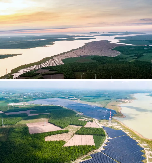 越南油汀光伏电站项目位于越南西宁省油汀水库消落带,占地面积达580公顷,总装机容量500兆瓦,建设合同总工期335天,是目前东南亚装机规模最大的光伏项目。在紧迫的工期内,华东院EPC项目团队连续克服施工资源匮乏、现场条件多变等问题,在各方的共同努力下,于2019年6月18日顺利按期完成试运行并通过并网验收,正式进入商业运行。
