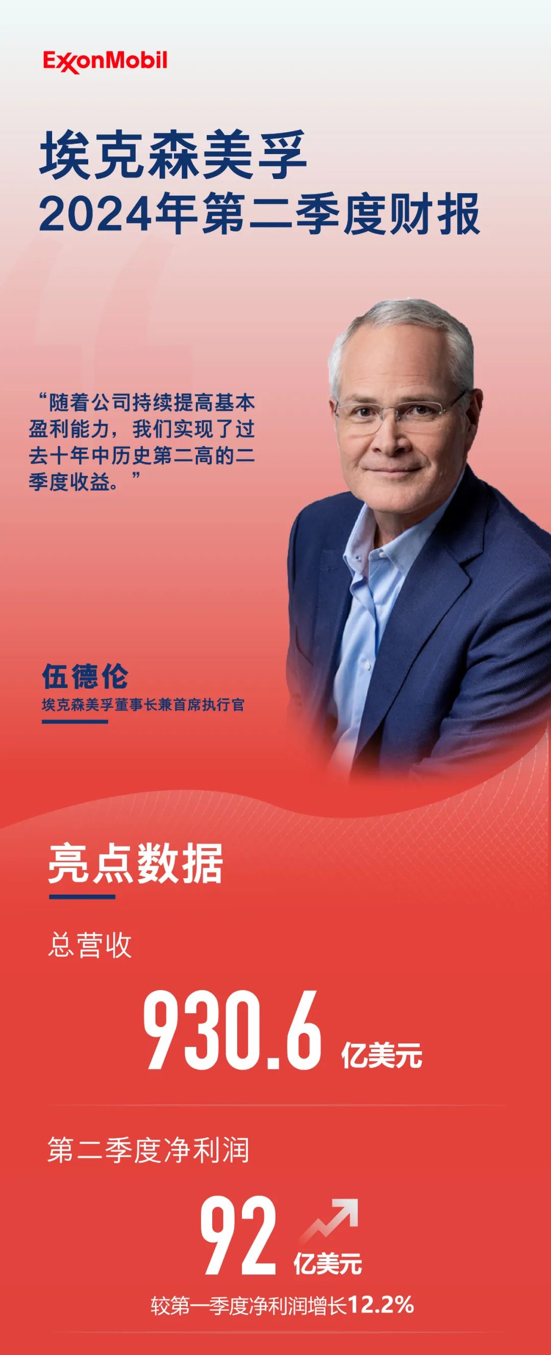 与日俱增!埃克森美孚2024年第二季度总营收930.6亿美元