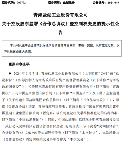 盐湖股份9月8日晚间,盐湖股份(000792.SZ)公告,公司控股股东将变为中国盐湖工业集团有限公司(简称:中国盐湖集团),实控人将变为中国五矿集团有限公司(简称:中国五矿)。