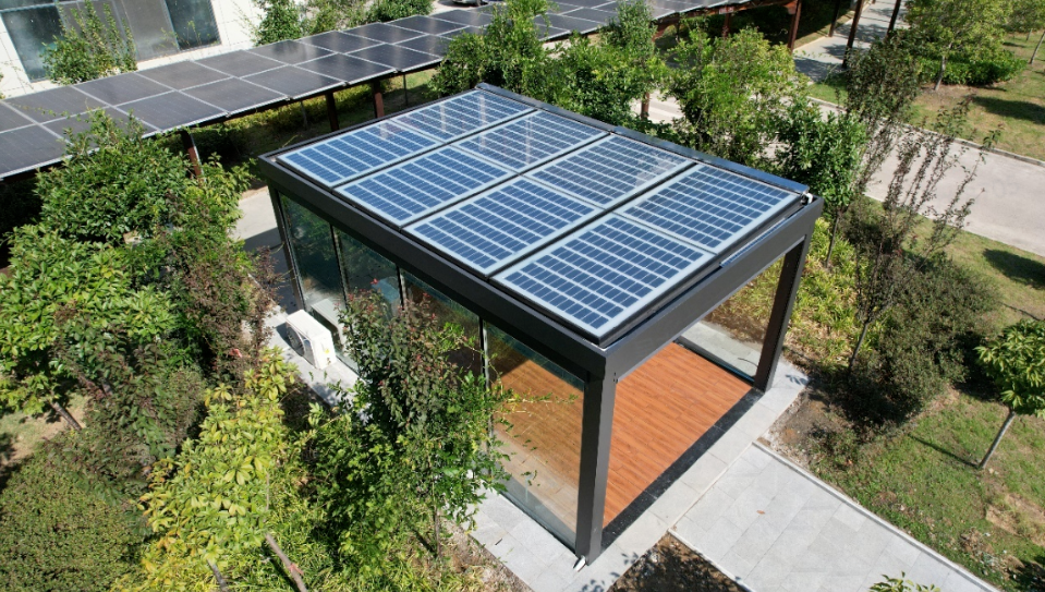 固德威光电建材也可以应用在阳光房中,其中星宇系列与阳光房高度适配。其半透光的产品特性兼顾了发电和遮阳的功效,独特的无光斑设计消除了电池片对室内的光影效果,减少使用者的眩光,提升居住舒适度,同时具备保温隔热、防水的基本属性。这款高度定制化的产品可以根据项目实际需求改变尺寸、玻璃厚度以及透光率等。安装后的效果与阳光房一体化集成,整洁美观。