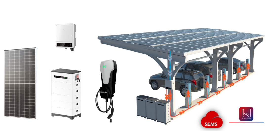 固德威北极系列光电建材、逆变器、储能、智慧能源管理平台的结合,最终得到了一个集发电、储能、充电和智慧能源管理功能为一体的智能微网系统。应用在车棚场景中,即是我们所说的光储充一体化车棚。整个系统可通过并、离网运行模式的无缝切换与电网实现智能互动,在为电动汽车提供绿色能源的同时,兼顾了电力削峰填谷等功能,极大提升整个系统的经济效益。