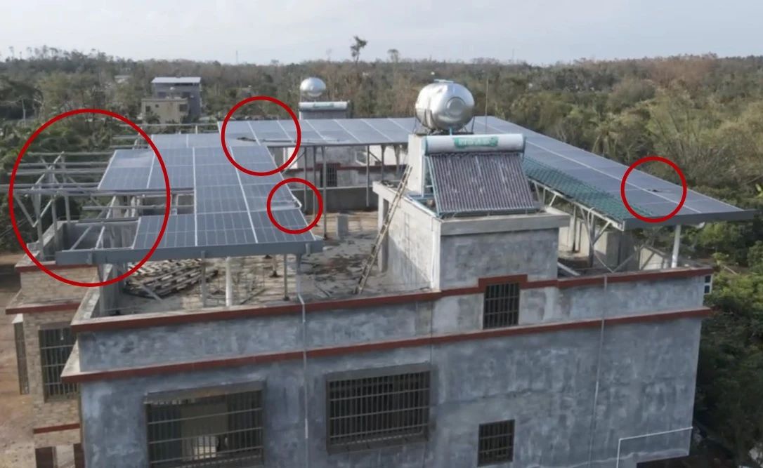 再对比看一下相隔3公里的其他品牌户用分布式电站的情况,某品牌的双玻组件在“摩羯”肆虐下,飞落7块组件,并有多处组件破损,损失较为严重。