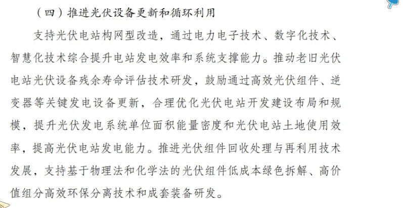 支持光伏电站构网型改造,通过电力电子技术、数字化技术、智慧化技术综合提升电站发电效率和系统支撑能力。推动老旧光伏电站光伏设备残余寿命评估技术研发,鼓励通过高效光伏组件、逆变器等关键发电设备更新,合理优化光伏电站开发建设布局和规模,提升光伏发电系统单位面积能量密度和光伏电站土地使用效率,提高光伏电站发电能力。推进光伏组件回收处理与再利用技术发展,支持基于物理法和化学法的光伏组件低成本绿色拆解、高价值组分高效环保分离技术和成套装备研发。