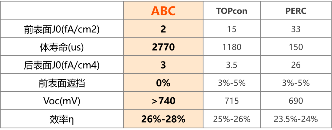 与传统电池技术相比,爱旭N型ABC的前表面复合电流仅为2fA/cm2,TOPCon则为15 fA/cm2;由于金属结构集中于背面,N型ABC电池硅片电阻率更高,电池体寿命也更高;N型ABC正面无栅线,直接将传统技术3%-5%的前表面遮挡降为零,从而提升转换效率。