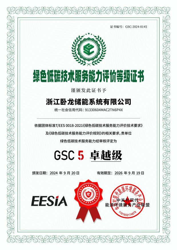 与此同时,在中关村现代能源环境服务产业联盟(EESIA)举办的绿色低碳技术服务能力评价等级评选中,卧龙储能荣获最高级别的GSC5卓越级认证。