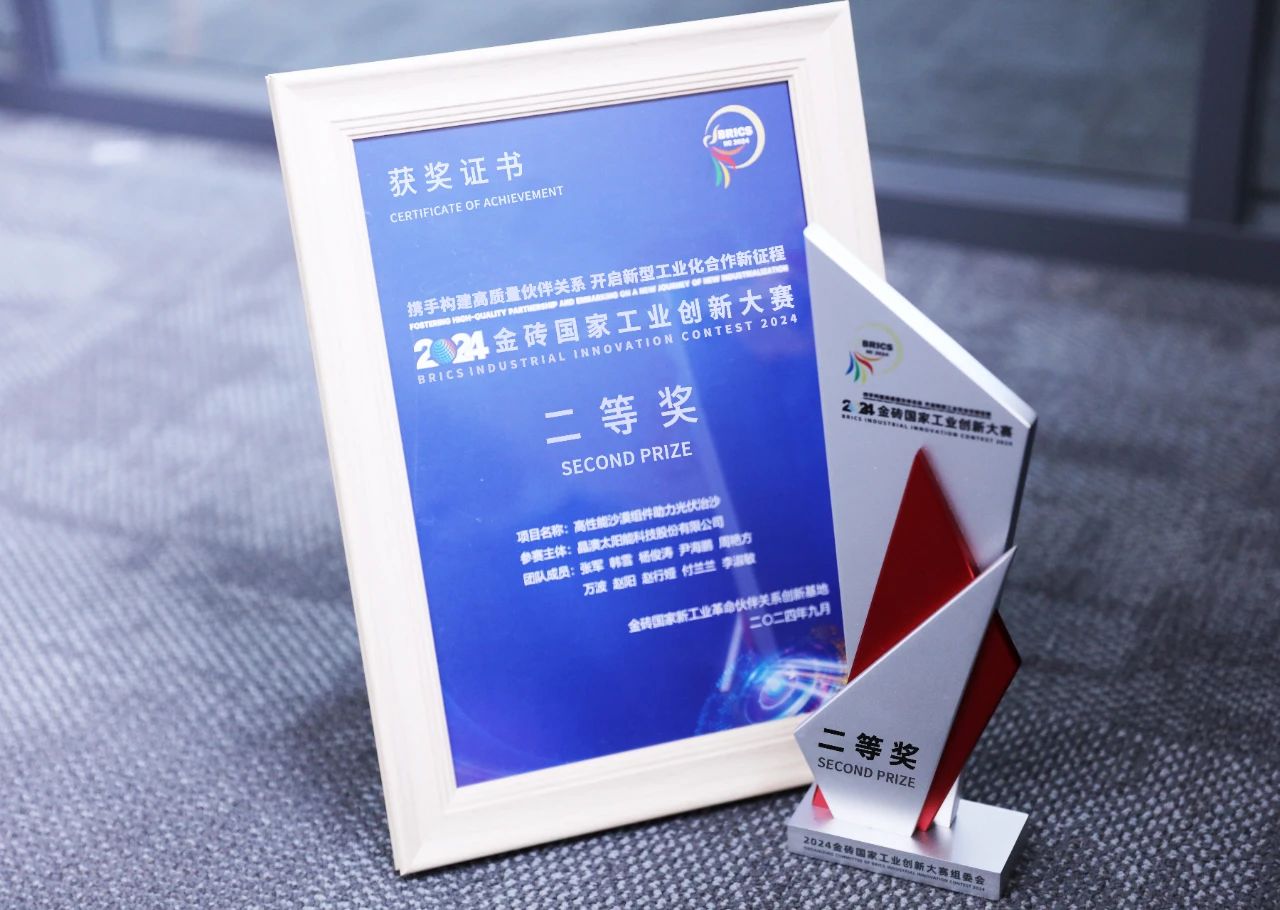 针对这些痛点,晶澳科技一直在设计开发高性能沙漠组件,以期最大化实现光伏治沙的发电效益与生态效益,终取得重大成果。2024年9月,晶澳科技凭借“高性能沙漠组件助力光伏治沙”项目,以光伏行业最好成绩荣获金砖国家工业创新大赛二等奖,并被纳入“金砖国家工业创新合作项目库”,向金砖国家做定向案例展示。