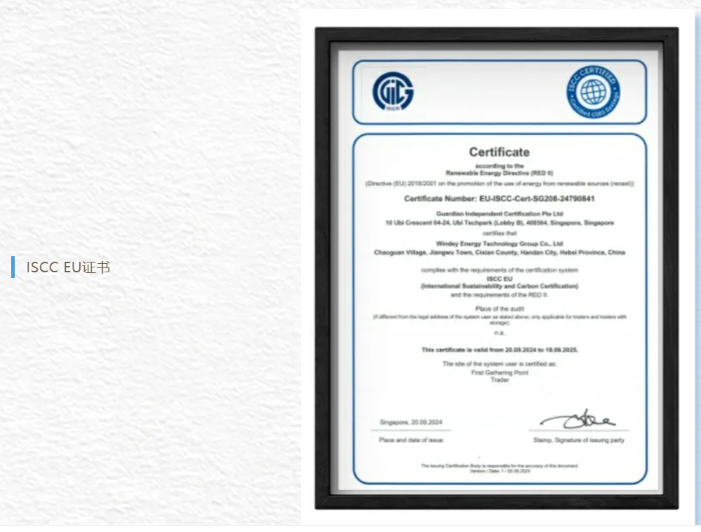 针对这一发展趋势,运达股份敏锐洞察,统筹布局,以科技创新驱动绿色能源发展,着手推动绿色甲醇产业链条建设。今年1月,运达股份河北邯郸绿色甲醇制备示范区项目成功签约,以“风电机组—绿电—绿氢—绿醇”全产业链的形式打造邯郸新能源国际创新港,引领行业率先垂范。凭借科研领域的不懈攻关,运达股份邯郸绿色甲醇项目于日前喜获中国首张以农场/种植园为原点的绿色甲醇原料端国际可持续性和碳认证(简称ISCC EU)证书,不仅为公司后续的绿色甲醇产品认证工作提供了有力的技术支撑,更为中国绿色航运的脱碳转型提供了极富价值的参考路径。目前,运达股份在原料种植、收集处理、甲醇生产加工、原料与产品运输、仓储和贸易等关键环节均实现了绿色减排设计,预计每干吨船用燃料(绿色甲醇)的减排量将显著超越欧盟“可再生能源指令(RED II)”和“Fuel EU Maritime”法规的碳减排标准。