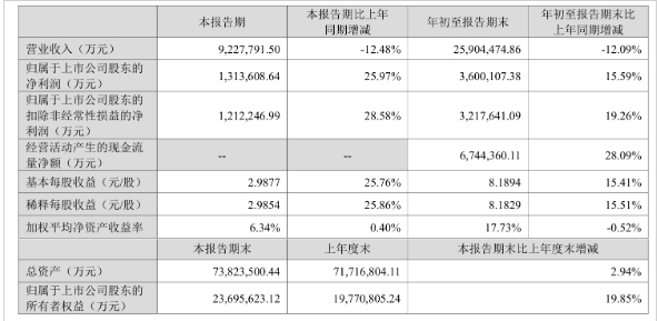 宁德时代(300750)10月19日披露2024年第三季度报告。前三季度公司实现营业收入2590.45亿元,同比下降12.09%;归母净利润360.01亿元,同比增长15.59%;扣非净利润321.76亿元,同比增长19.26%;经营活动产生的现金流量净额为674.44亿元,同比增长28.09%;报告期内,宁德时代基本每股收益为8.1894元,加权平均净资产收益率为17.73%。