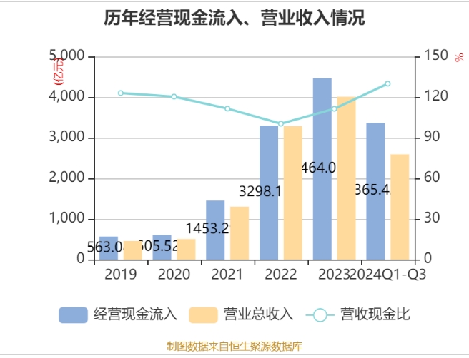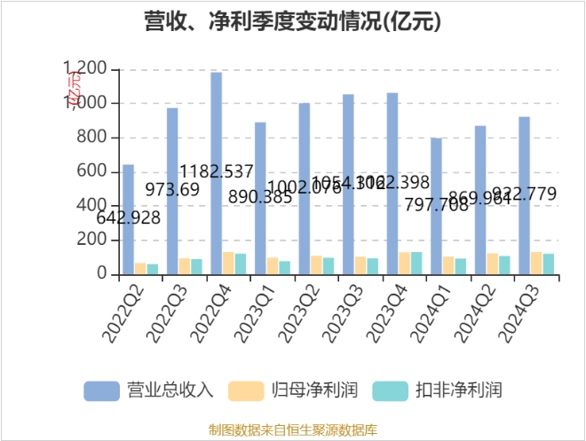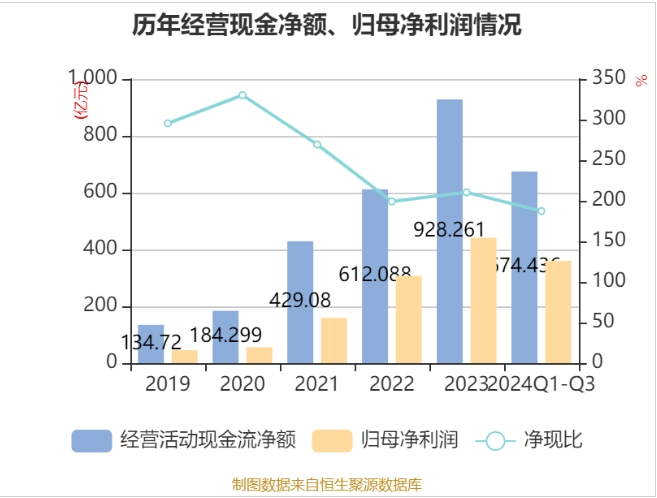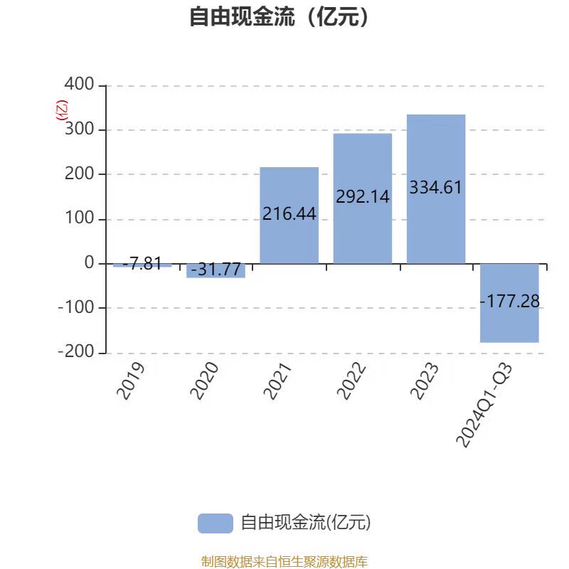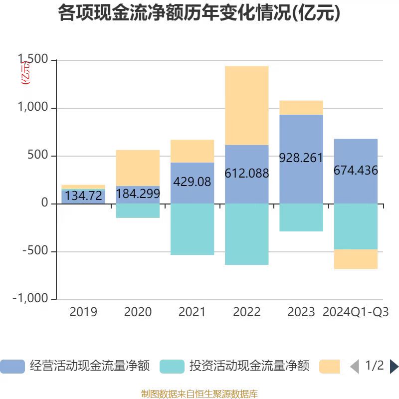 2024年前三季度,公司经营活动现金流净额为674.44亿元,同比增长28.09%;筹资活动现金流净额-204.96亿元,同比减少353.46亿元;投资活动现金流净额-478.94亿元,上年同期为-199.37亿元。