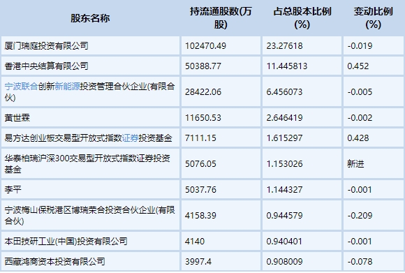 三季报显示,2024年三季度末的公司十大流通股东中,新进股东为华泰柏瑞沪深300交易型开放式指数证券投资基金,取代了二季度末的深圳市招银叁号股权投资合伙企业(有限合伙)。在具体持股比例上,香港中央结算有限公司、易方达创业板交易型开放式指数证券投资基金持股有所上升,厦门瑞庭投资有限公司、宁波联合创新新能源投资管理合伙企业(有限合伙)、黄世霖、李平、宁波梅山保税港区博瑞荣合投资合伙企业(有限合伙)、本田技研工业(中国)投资有限公司、西藏鸿商资本投资有限公司持股有所下降。