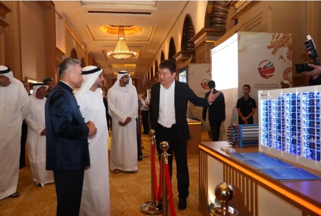 在此次先进制造展上,阿联酋经济部次长阿卜杜拉·萨利赫到访天合展台,对天合氢能方案表示肯定。阿联酋经济部是阿联酋联邦政府负责对外贸易管理的主要部门,负责制定外国直接投资政策。早在今年1月,天合光能董事长兼CEO高纪凡出席世界经济论坛2024年年会期间,就与阿联酋经济部长阿卜杜拉·本·图克·马里,探讨如何通过合作加快全球能源转型的步伐,共同开创清洁、高效、可持续的能源未来。作为推动双边合作的重要力量,阿联酋经济部始终高度关注天合在清洁能源领域的技术进展。