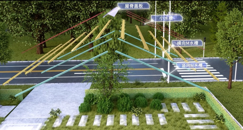 屋顶电站整体排水和积水同样是防水难点,TCL光伏科技为“晴晖顶”研发了业内高规格的刚性层叠垂直排水系统,排水能力显著升级。该系统综合利用小水槽和M型水槽,全面收集组件长边和短边缝隙间的雨水,两种水槽在双坡屋面纵横排列,形成“内疏外导”的完整防水体系,确保雨水及时排出。