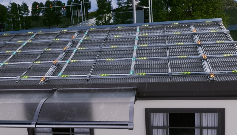 此外,少数屋顶光伏电站在施工时可能破坏屋顶原有的防水层或瓦片,反倒造成雨水渗漏问题,这也是用户对安装屋顶光伏的核心顾虑之一。“晴晖顶”将刚性层叠排水系统安装在光伏板与屋顶瓦片层的中间层位置,避免“破瓦立柱”等施工环节影响到防水性能,并使屋面在下雨时拥有光伏板-刚性层叠排水系统-屋顶原有瓦片三重保障,有助于延长屋面使用寿命。