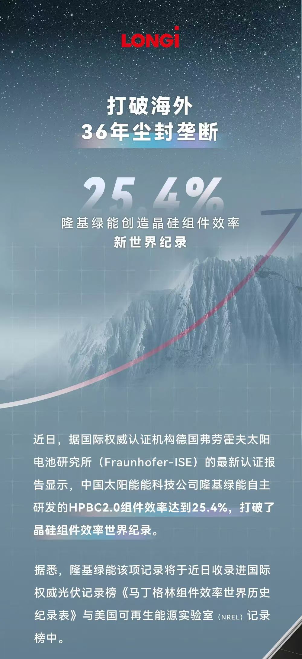 跃居顶峰!隆基绿能打破海外36年尘封垄断 创造晶硅组件效率新世界纪录