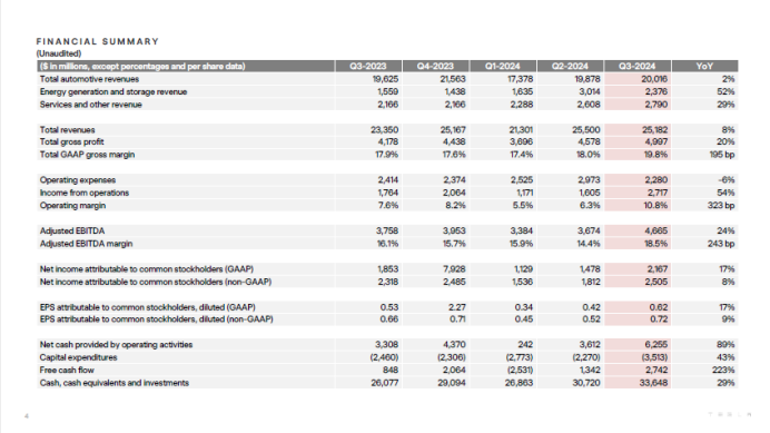 2024年10月23日盘后,特斯拉公布2024年第三季度财报。财报显示,特斯拉总收入、毛利润双双增长,分别达到251.82亿美元与4.9亿美元。第三季度总收入同比增长8%。
