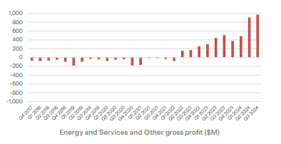 特斯拉总结盈利能力提升原因时,总结出7条影响因素,除了汽车交付量等营业额的直接上涨、相关产品成本降低外,特斯拉还特别指出了“能源生产和储存以及相关服务、其他方面的增长”这一因素。