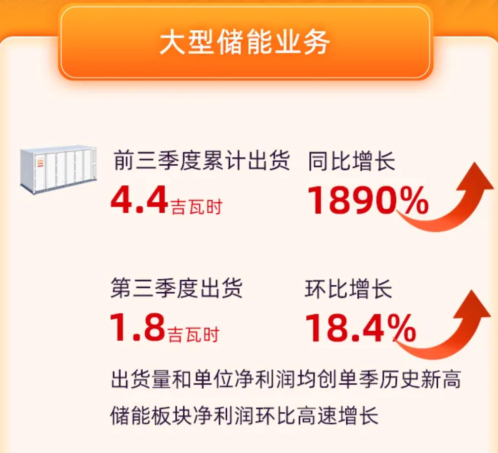2024年1-9月,公司大型储能产品出货达4.4GWh,同比增长1890%;其中第三季度出货达1.8GWh,环比增长18.4%,出货量和单位净利润均创单季历史新高。