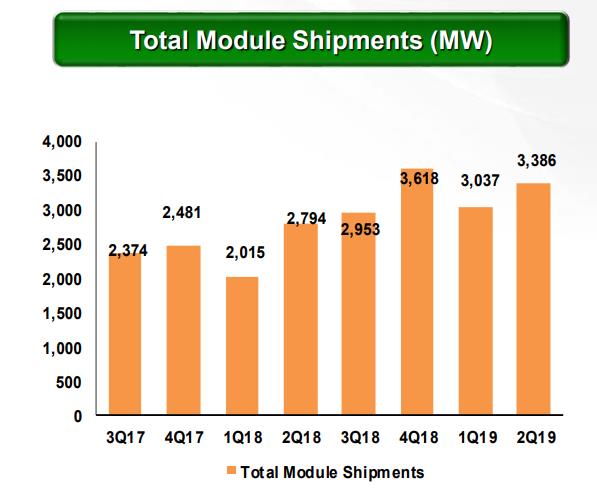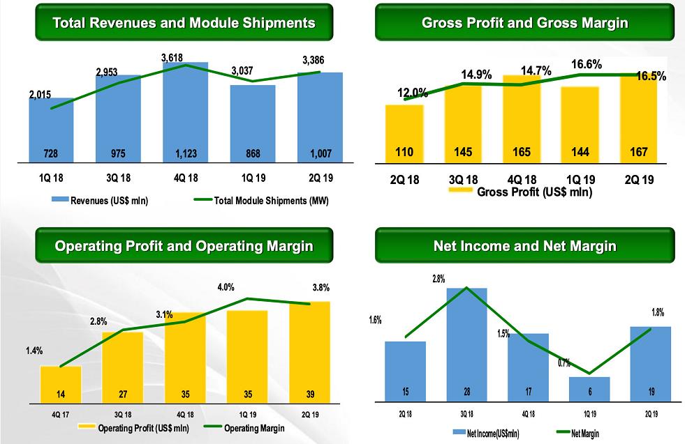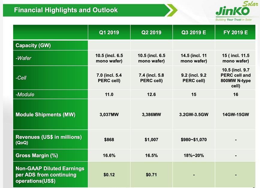 ◎ 2019年第三季度,公司预计太阳能组件出货量在3.2吉瓦到3.5吉瓦之间。营业收入在9.8亿美元和10.7亿美元之间,毛利率在18%和20%之间。
