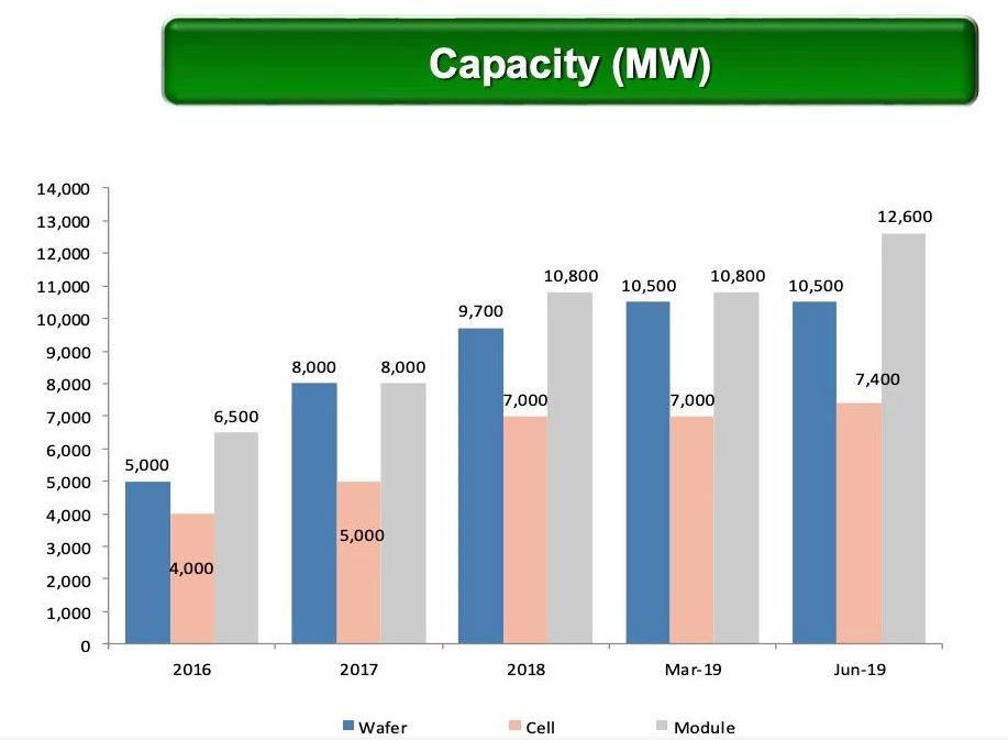 “我们加速高效单晶产能的扩张,以满足增长中的全球需求。乐山新项目预计年底单晶产能将达5吉瓦,二期产能扩张完成后公司总产能将达到16.5吉瓦。截至2019年6月30日,公司的硅片、电池片和组件产能分别达到10.5吉瓦、7.4吉瓦和12.6吉瓦。预期2019年年底,公司的硅片、电池片和组件产能将分别达到15吉瓦、10.5吉瓦和16.0吉瓦,其中包括11.5吉瓦的单晶硅片产能,9.7吉瓦的PERC电池产能和800兆瓦的N型电池产能。”