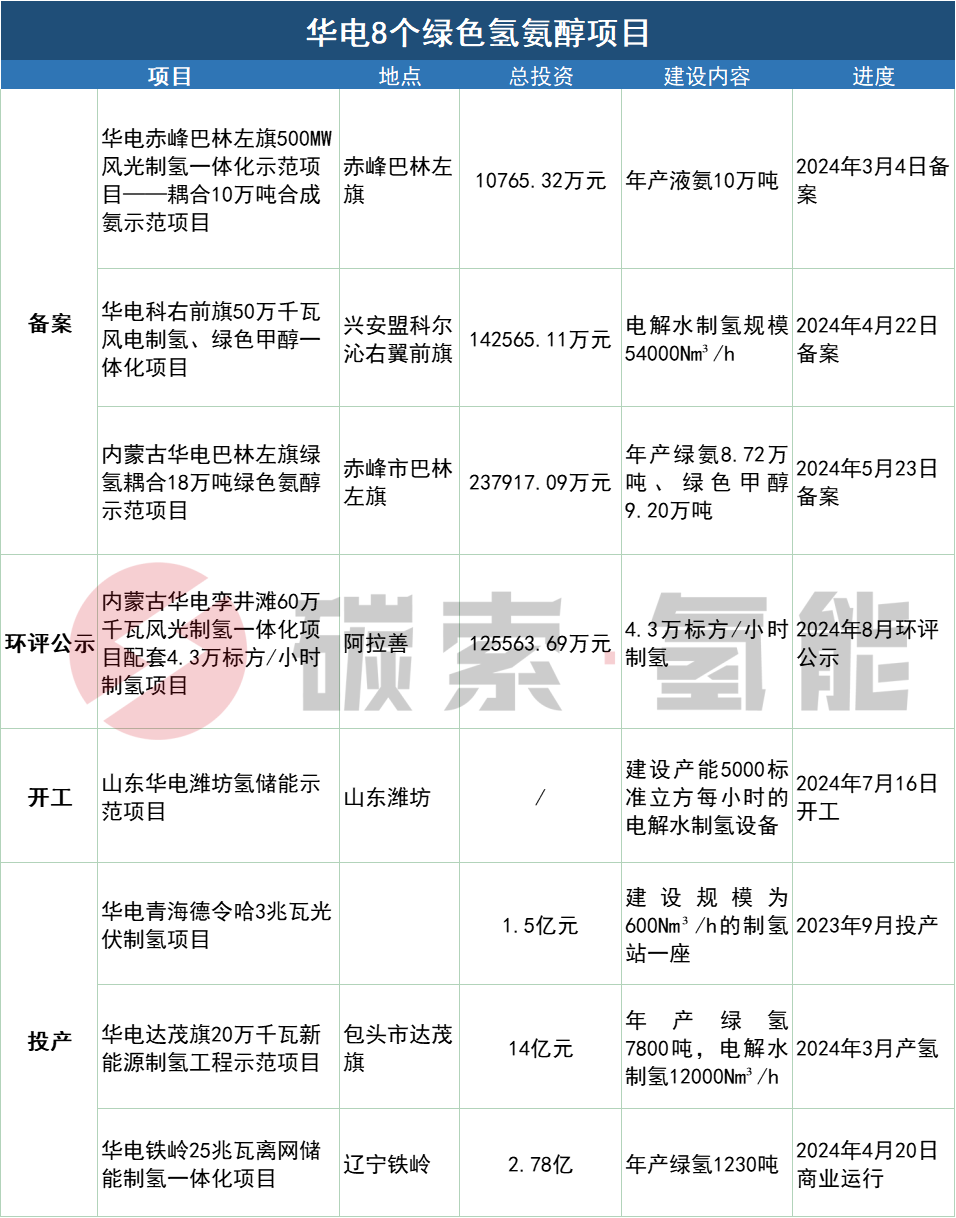 据碳索氢能网梳理,华电在国内有8个正在推进的绿色氢氨醇项目,其中3个备案,1个环评公示、1个开工,3个投产。详情如下: