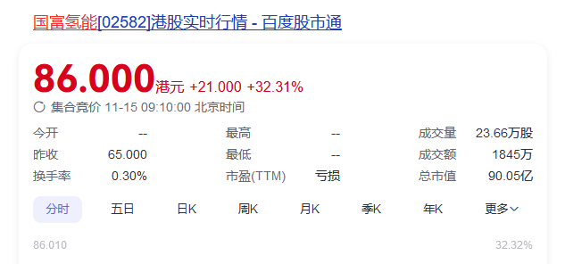 11月15日,国富氢能(股票代码:02582.HK)顺利在香港联合交易所主板挂牌上市,每股股票的发行价格确定为65港元。上市首日,仅至上午9点10分,其股价已攀升至86港元,实现了32.31%的涨幅,公司的总市值也因此超过了90.05亿港元。