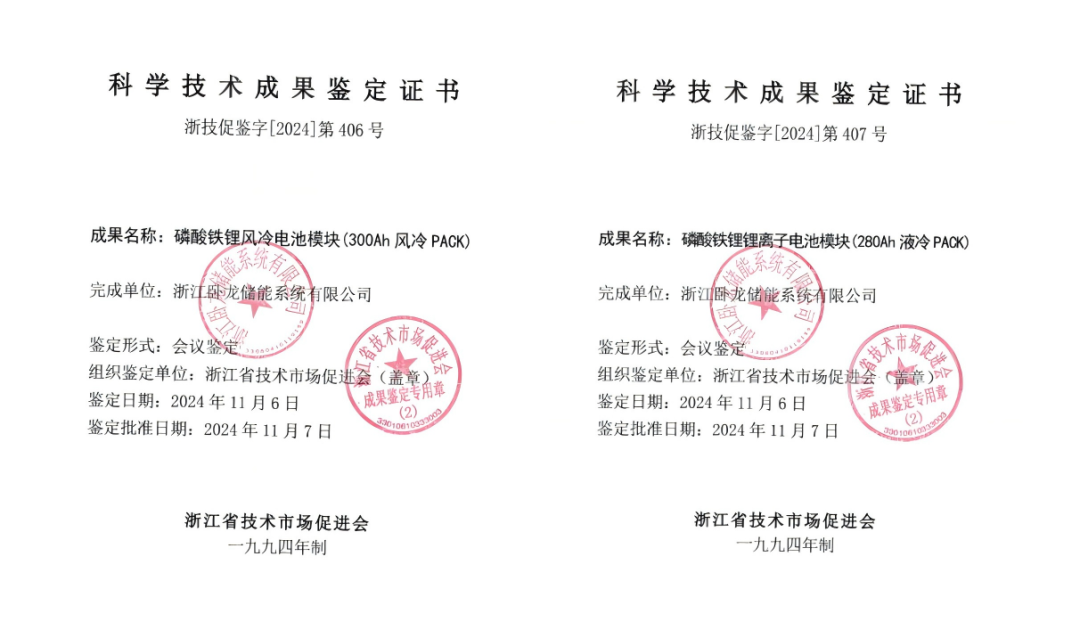 2024年11月6日,浙江省技术市场促进会在上虞组织召开了由浙江卧龙储能系统有限公司承担的浙江省新产品试制计划项目“磷酸铁锂风冷电池模块”和“磷酸铁锂锂离子电池模块”鉴定会。会上各位专家详细听取了产品试制工作与技术总结、产品检测、科技查新和用户使用等报告,仔细审查了相关资料。经过深入讨论,委员会给予了两款产品高度评价: