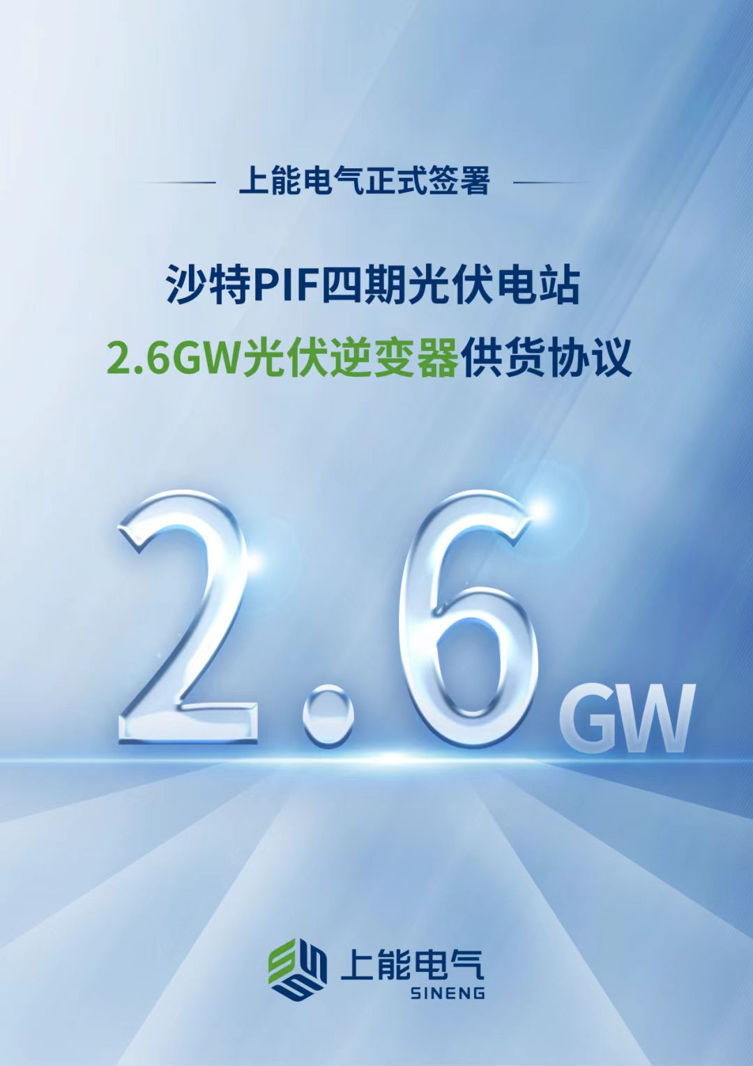 近日,上能电气正式签署由沙特国际电力和水务公司、沙特公共投资基金和沙特阿美电力公司共同投资建设的沙特PIF四期光伏电站2.6GW光伏逆变器供货协议。该项目是沙特阿拉伯国家可再生能源计划(NREP)规划中的又一大型光伏项目之一,也是上能电气持续深耕中东市场的又一显著成绩。